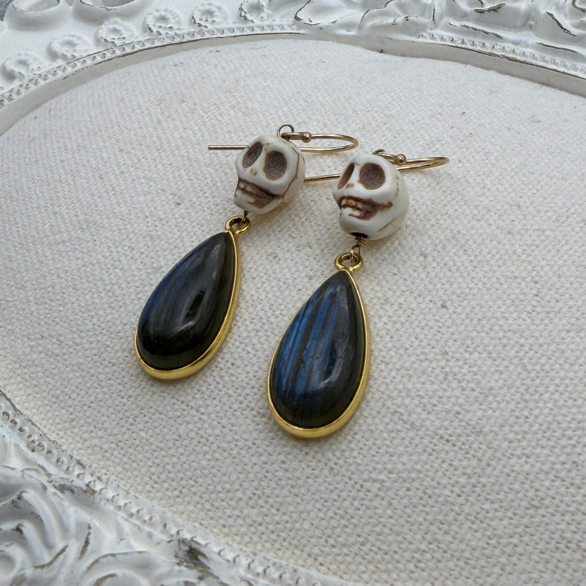 Luminous labradorite teardrops dance below two grinning skulls. Vermeil earwires and gold-filled accents.