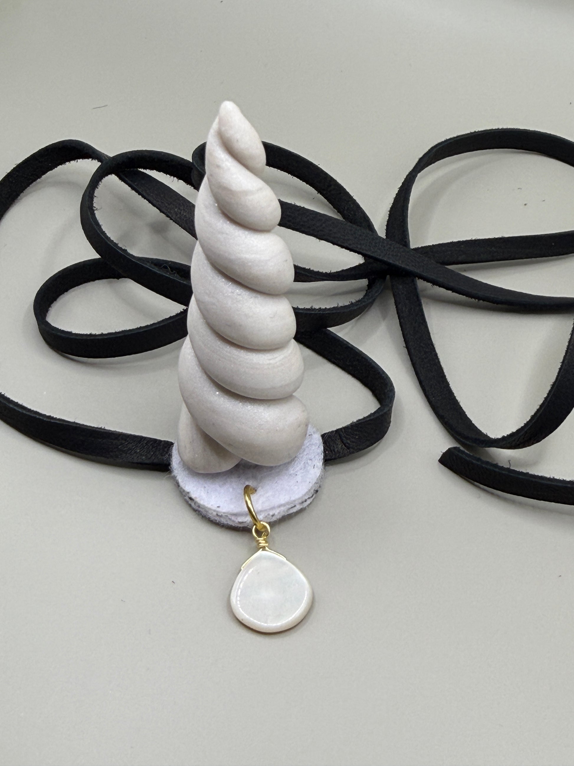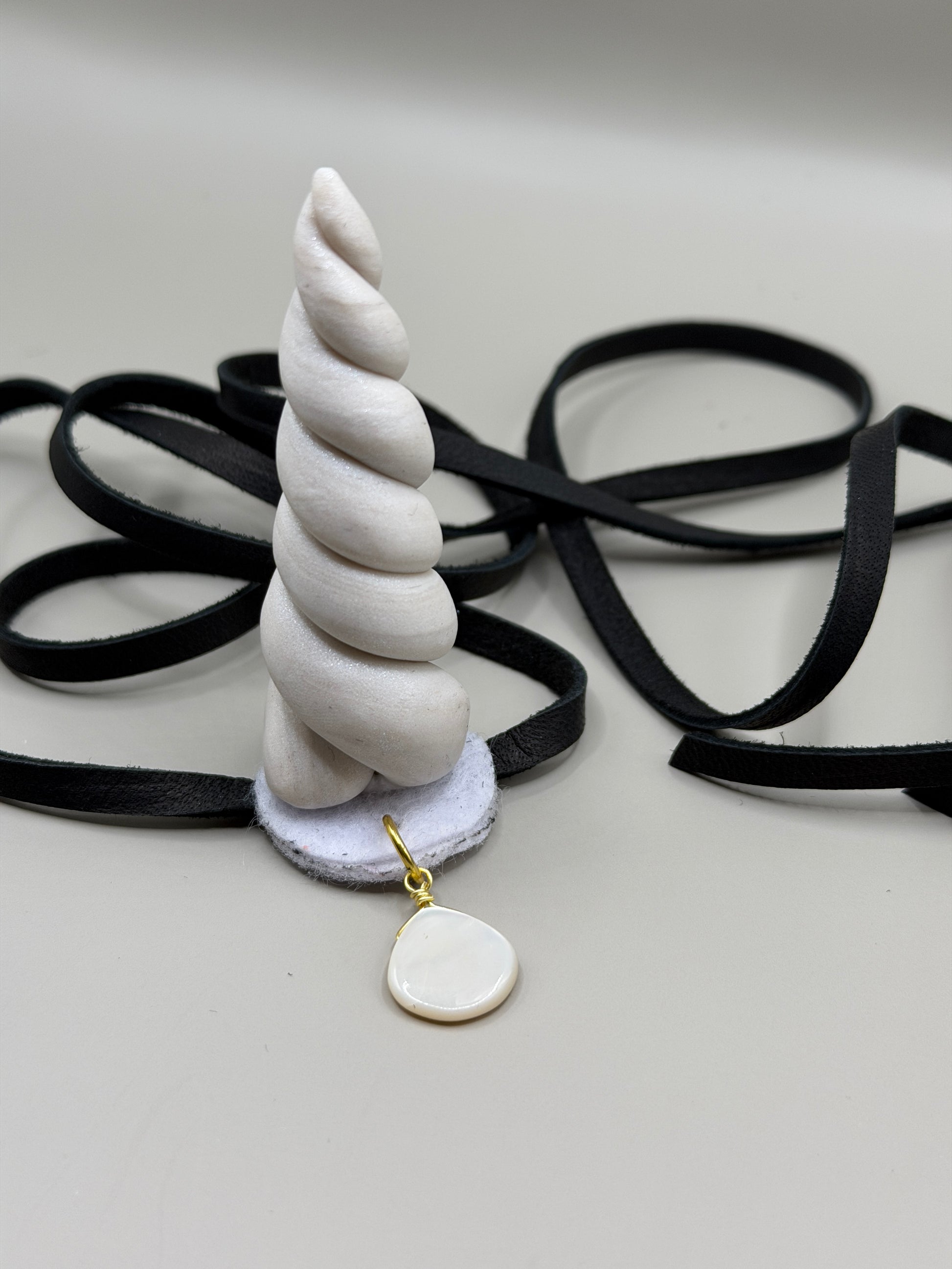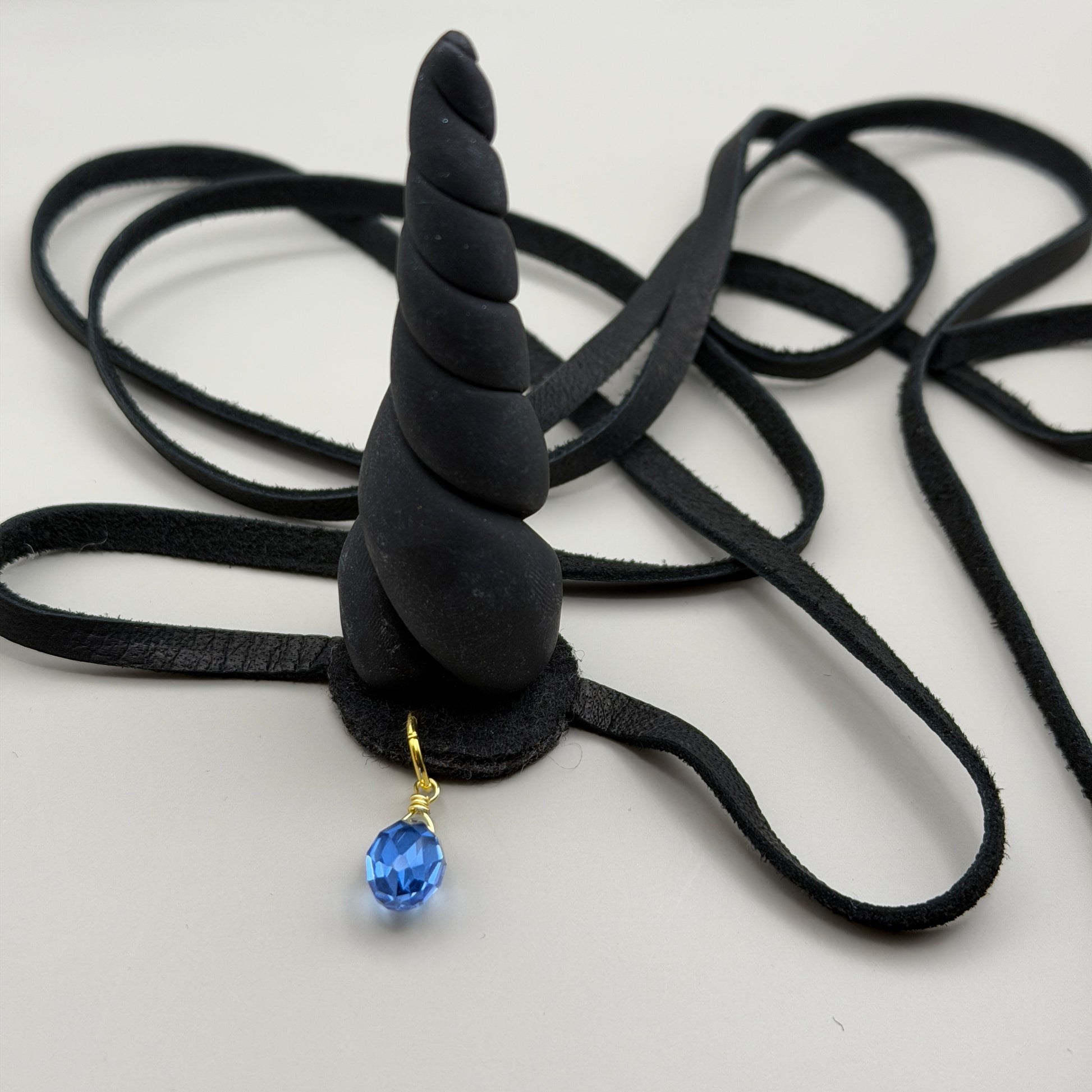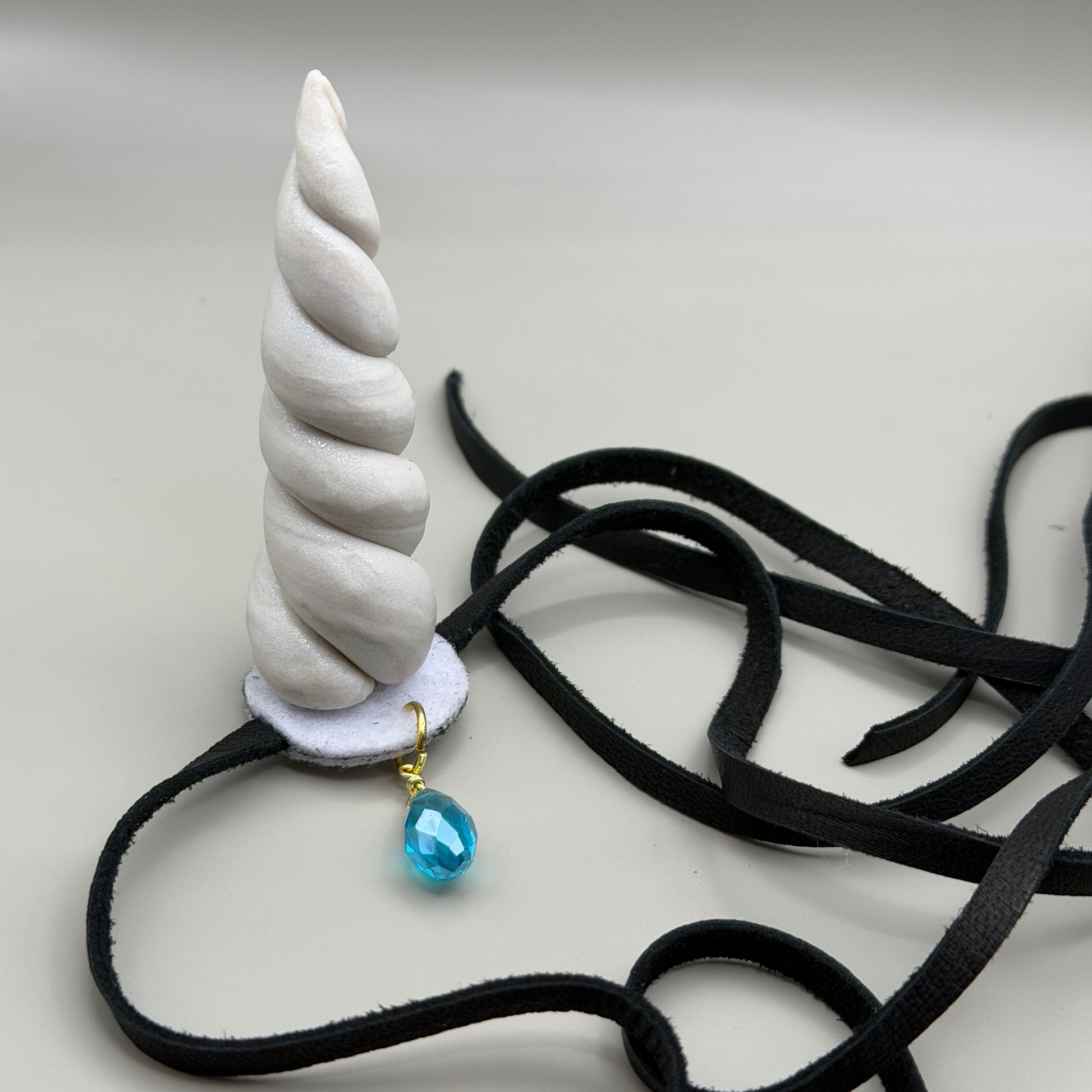 Shine as the unicorn that you are. Handmade of solid polymer clay, a teardrop shaped gem gives a little extra sparkle. Each leather headband wraps around the head, is adjustable, and can be tied in back or to the side.